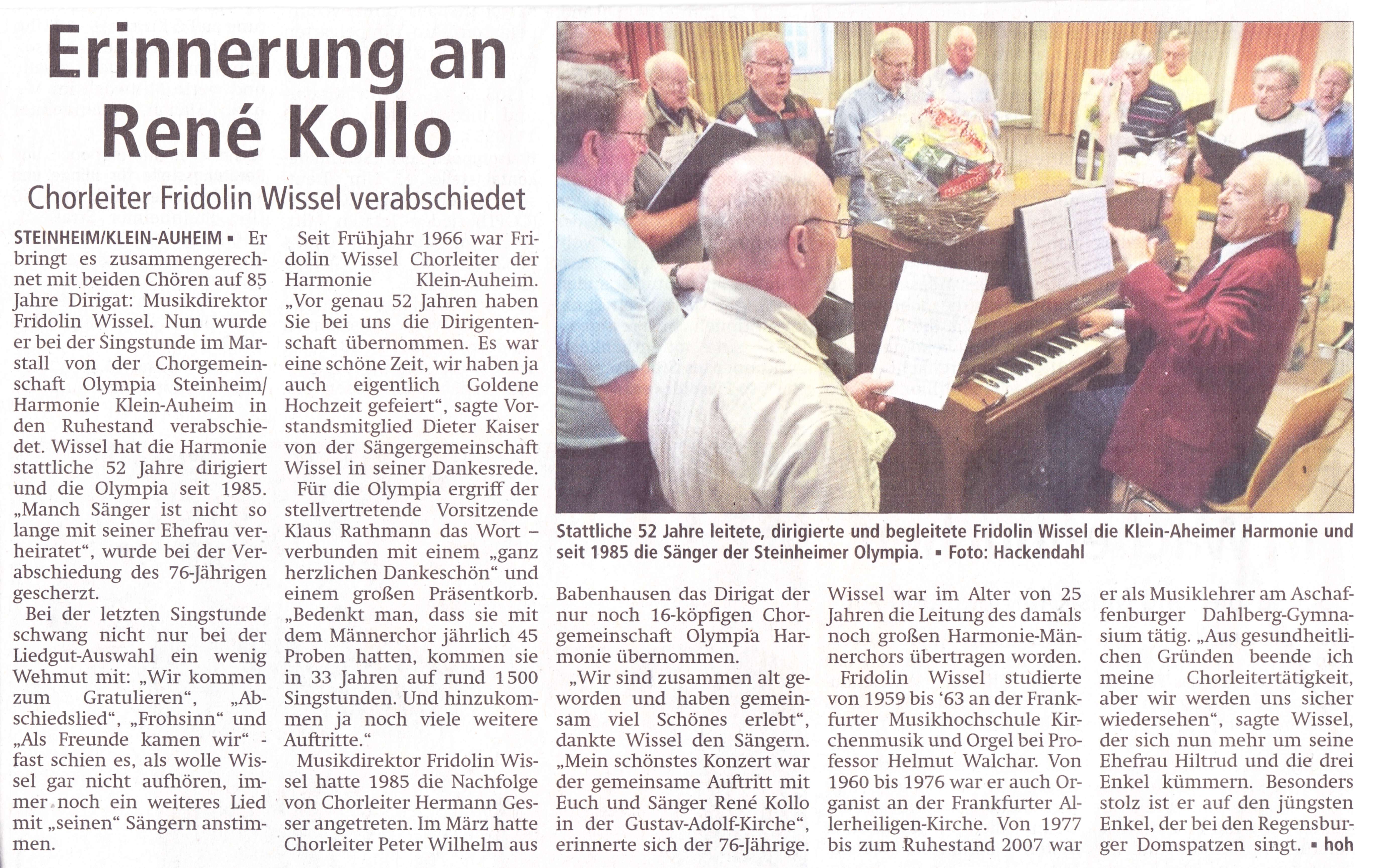 Herr Wissel hat den Olympia Männerchor seit 1985 geleitet und das auch über viele Jahre in der Singgemeinschaft mit der Sängervereinigung Harmonie Klein-Auheim. Bei der Harmonie war Herr Wissel sogar 52 Jahre im Dienst.